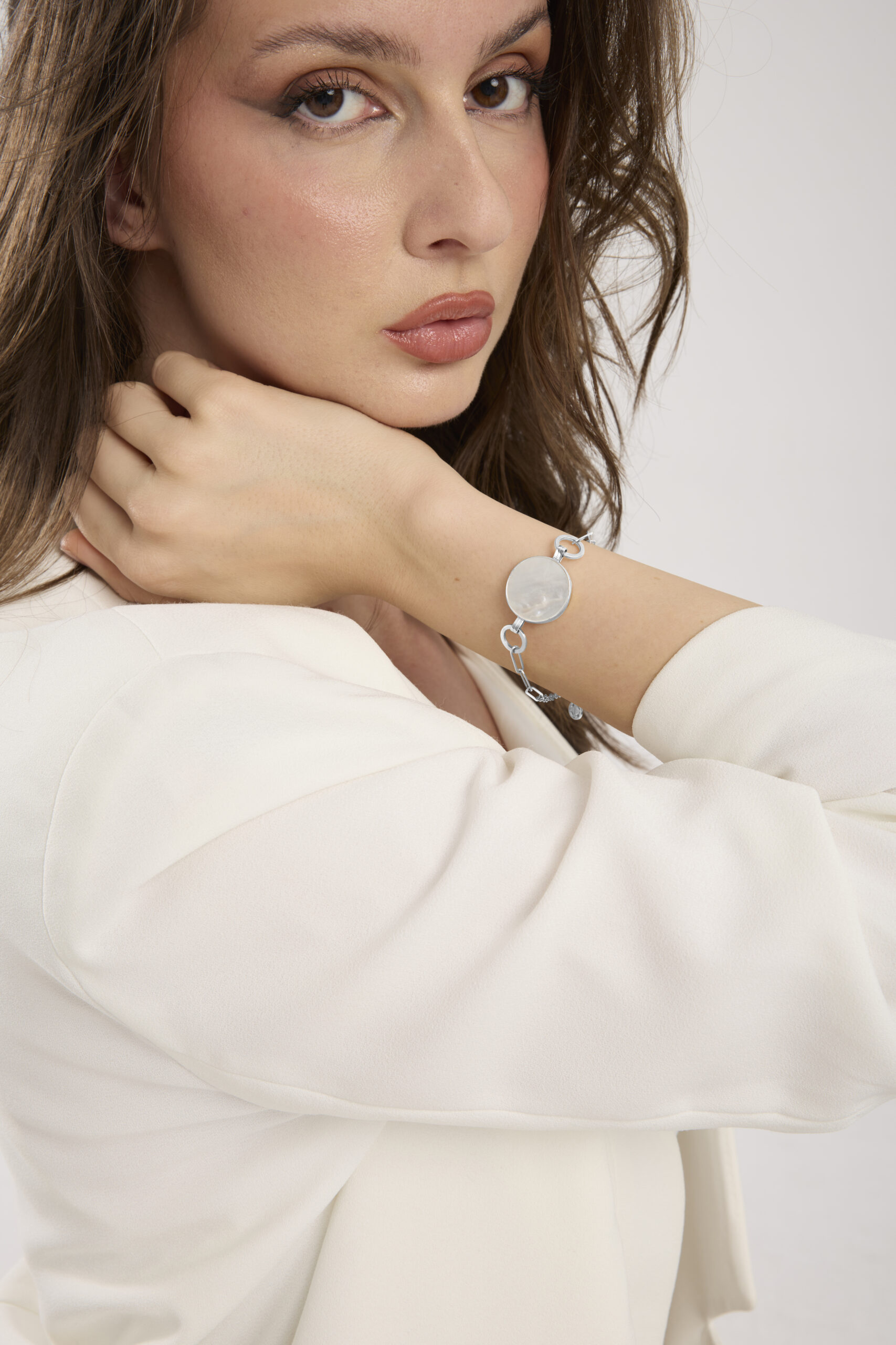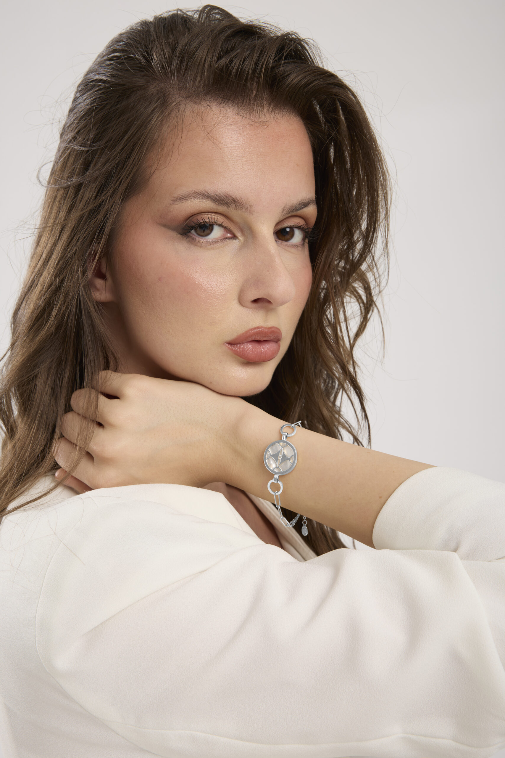 This handcrafted bracelet reveals our Voice of Your Heart emblem in polished gold, delicately set against a radiant white mother-of-pearl background. At its center, a brilliant-cut diamond amplifies its light and elegance. The nacre disc, with its gentle glow, symbolizes serenity and inner guidance.