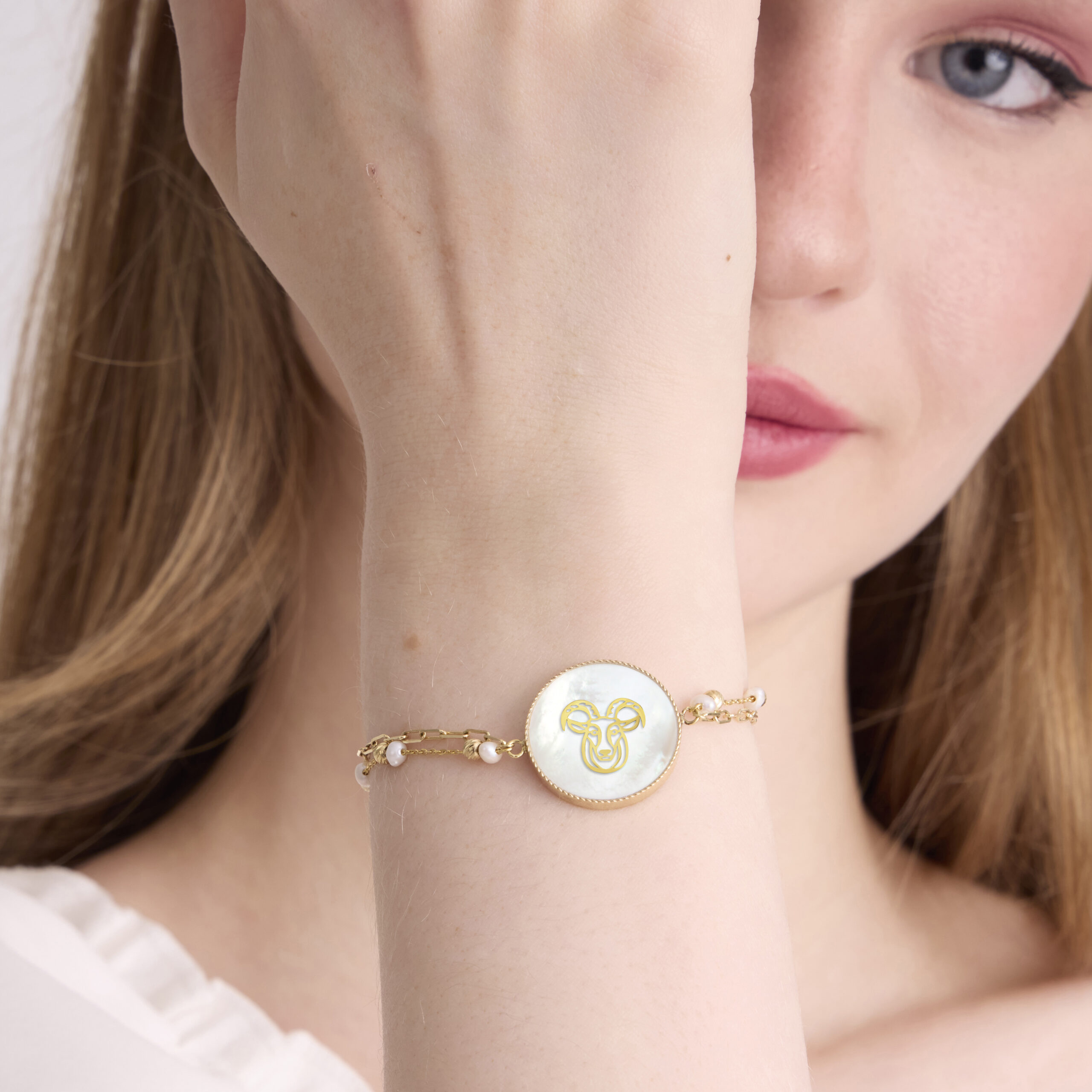 An intimate and symbolic jewel, this polished gold bracelet features a delicate mother-of-pearl disc revealing an openwork polished-gold Capricorn motif representing the Capricorn zodiac sign. Symbolizing discipline, wisdom, and inner strength, Capricorn embodies a grounded, determined, and deeply resilient energy. Its refined double chain, combining golden links and fine pearls, adds elegance and balance, while the mother-of-pearl softly reflects the light with every movement.