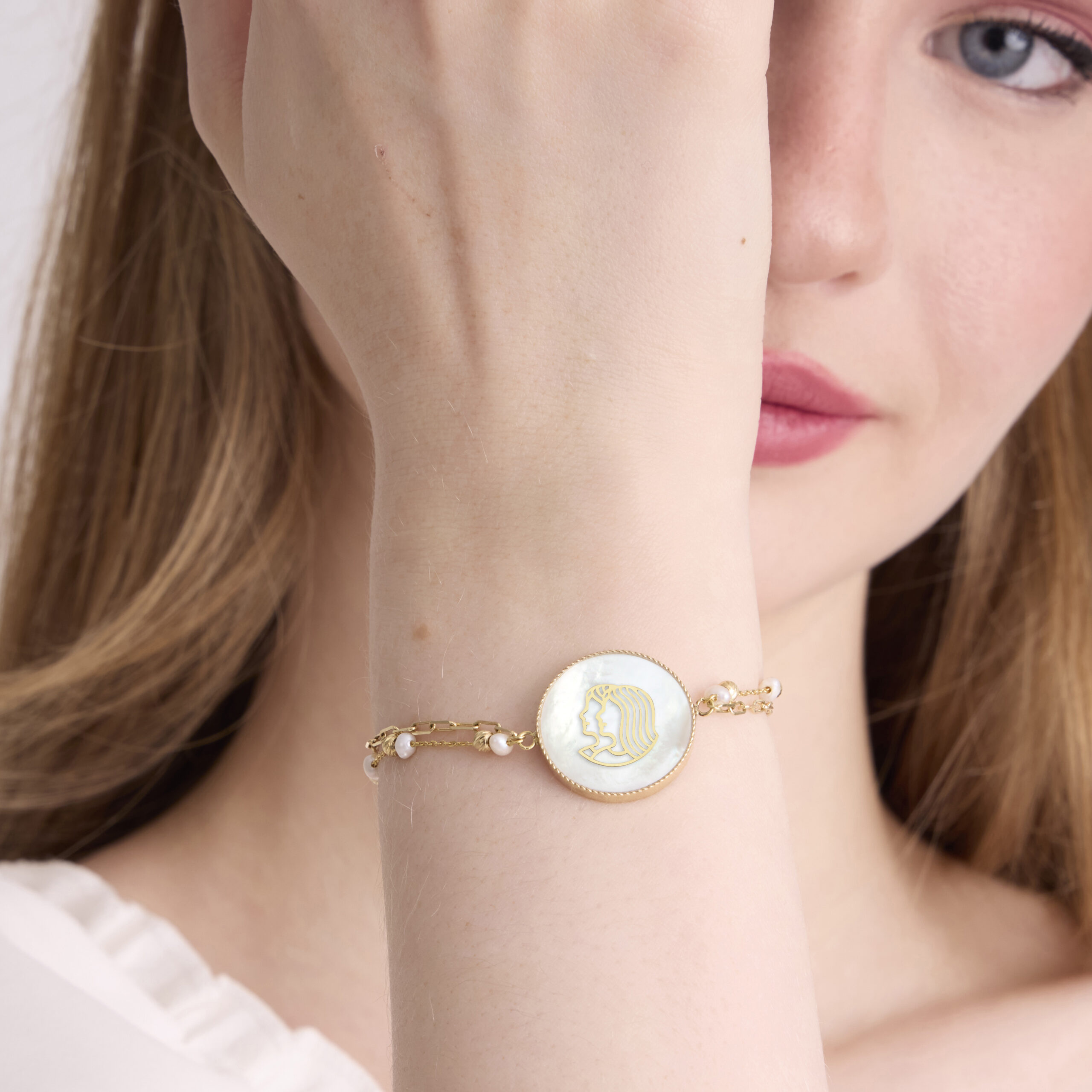 An intimate and symbolic jewel, this polished gold bracelet features a delicate mother-of-pearl disc revealing an openwork polished-gold motif representing the Gemini zodiac sign. Symbolizing communication, curiosity, and dual energy, Gemini embodies a vibrant, expressive spirit marked by adaptability and intellectual brightness. Its refined double chain, combining golden links and fine pearls, adds elegance and balance, while the mother-of-pearl softly reflects the light with every movement.