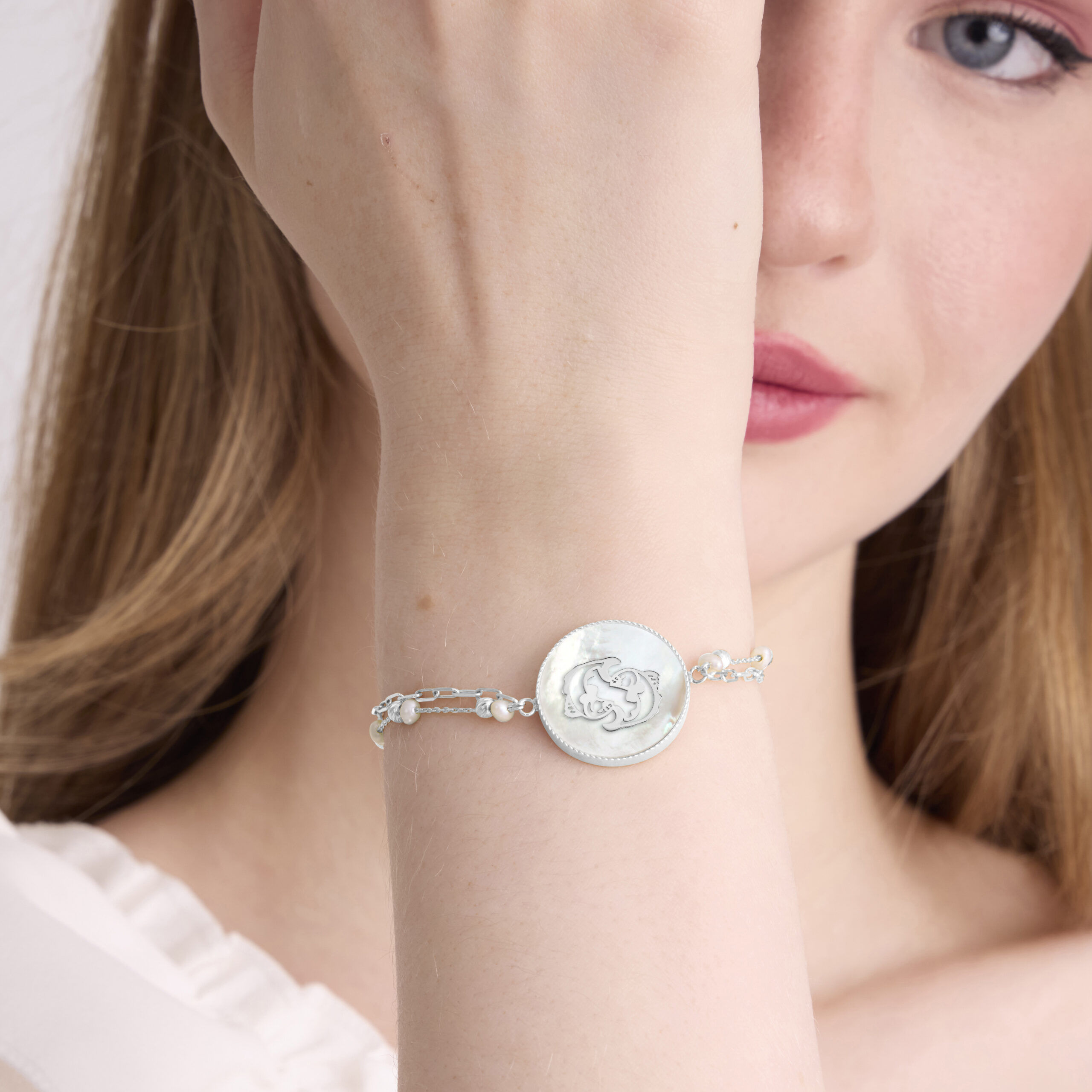 An intimate and symbolic jewel, this polished gold bracelet features a delicate mother-of-pearl disc revealing an openwork polished-gold Pisces motif representing the Pisces zodiac sign. Symbolizing intuition, empathy, and emotional depth, Pisces embodies a serene, imaginative, and spiritually attuned energy. Its refined double chain, combining golden links and fine pearls, adds elegance and balance, while the mother-of-pearl softly reflects the light with every movement.