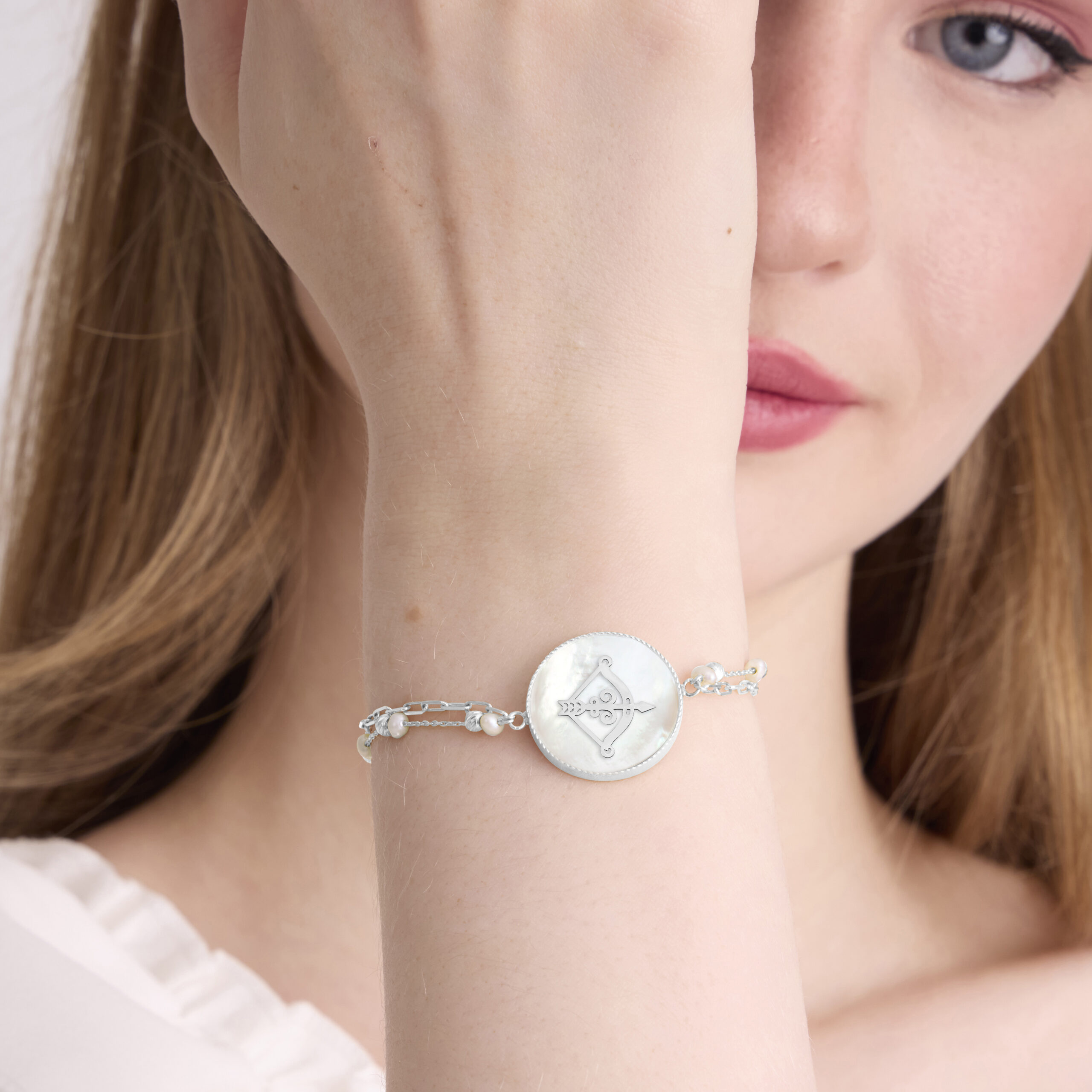 An intimate and symbolic jewel, this polished gold bracelet features a delicate mother-of-pearl disc revealing an openwork polished-gold Sagittarius motif representing the Sagittarius zodiac sign. Symbolizing freedom, optimism, and inner exploration, Sagittarius embodies a dynamic, adventurous spirit driven by truth, curiosity, and vision. Its refined double chain, combining golden links and fine pearls, adds elegance and balance, while the mother-of-pearl softly reflects the light with every movement.