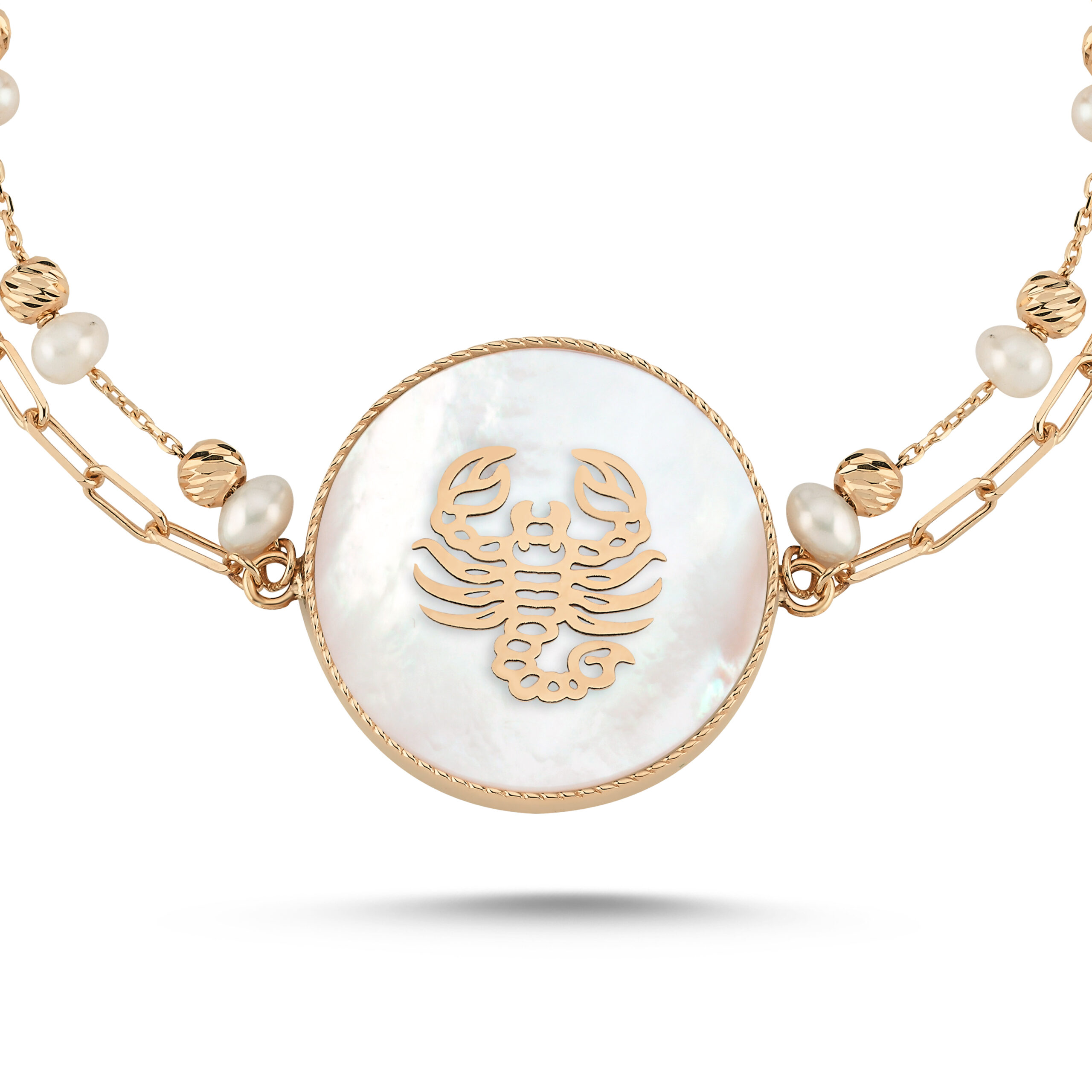 An intimate and symbolic jewel, this polished gold bracelet features a delicate mother-of-pearl disc revealing an openwork polished-gold Scorpio motif representing the Scorpio zodiac sign. Symbolizing intensity, transformation, and inner power, Scorpio embodies a magnetic, intuitive, and deeply emotional energy. Its refined double chain, combining golden links and fine pearls, adds elegance and balance, while the mother-of-pearl softly reflects the light with every movement.