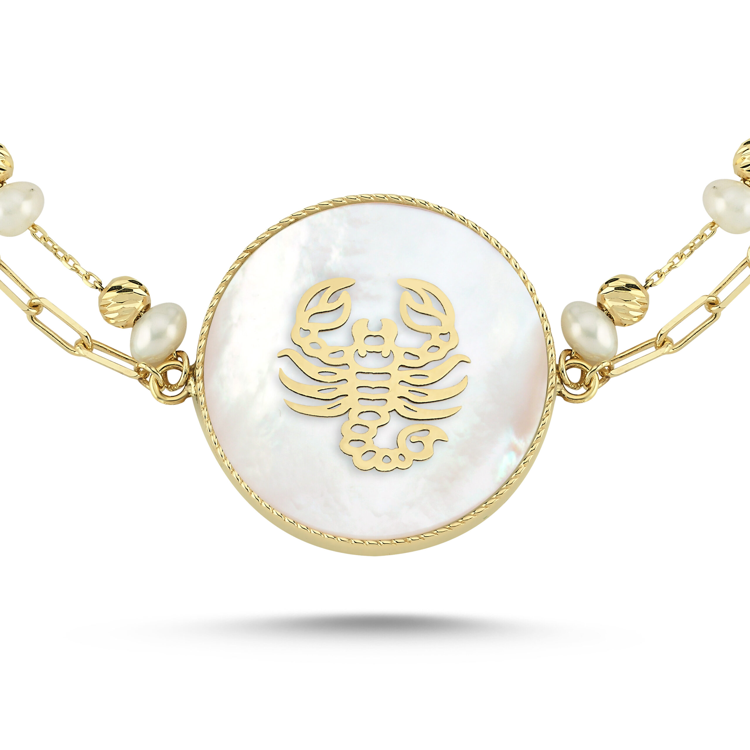An intimate and symbolic jewel, this polished gold bracelet features a delicate mother-of-pearl disc revealing an openwork polished-gold Scorpio motif representing the Scorpio zodiac sign. Symbolizing intensity, transformation, and inner power, Scorpio embodies a magnetic, intuitive, and deeply emotional energy. Its refined double chain, combining golden links and fine pearls, adds elegance and balance, while the mother-of-pearl softly reflects the light with every movement.