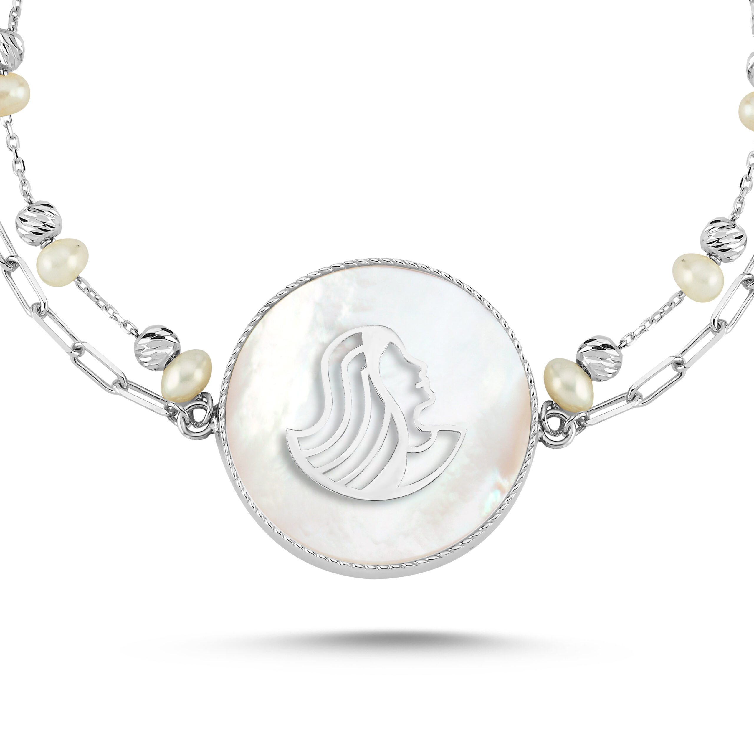 An intimate and symbolic jewel, this polished gold bracelet features a delicate mother-of-pearl disc revealing an openwork polished-gold Virgo motif representing the Virgo zodiac sign. Symbolizing precision, sensitivity, and inner harmony, Virgo embodies a gentle and thoughtful energy. Its refined double chain, combining golden links and fine pearls, adds elegance and balance, while the mother-of-pearl softly reflects the light with every movement.
