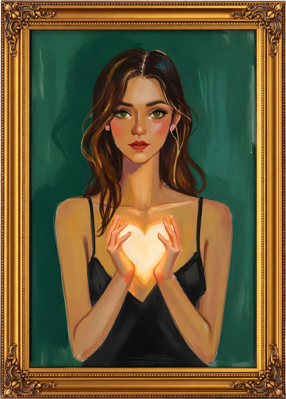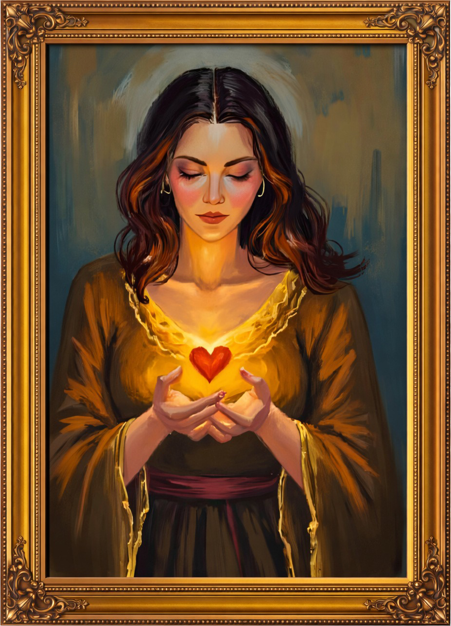 This tableau portrays a woman whose inner light takes shape in her hands a glow that is pure, gentle, and sovereign.
