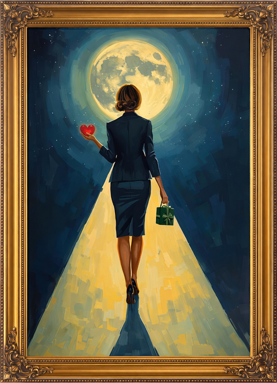 The heart she holds symbolizes the core of her power: intention, clarity, and emotional intelligence.