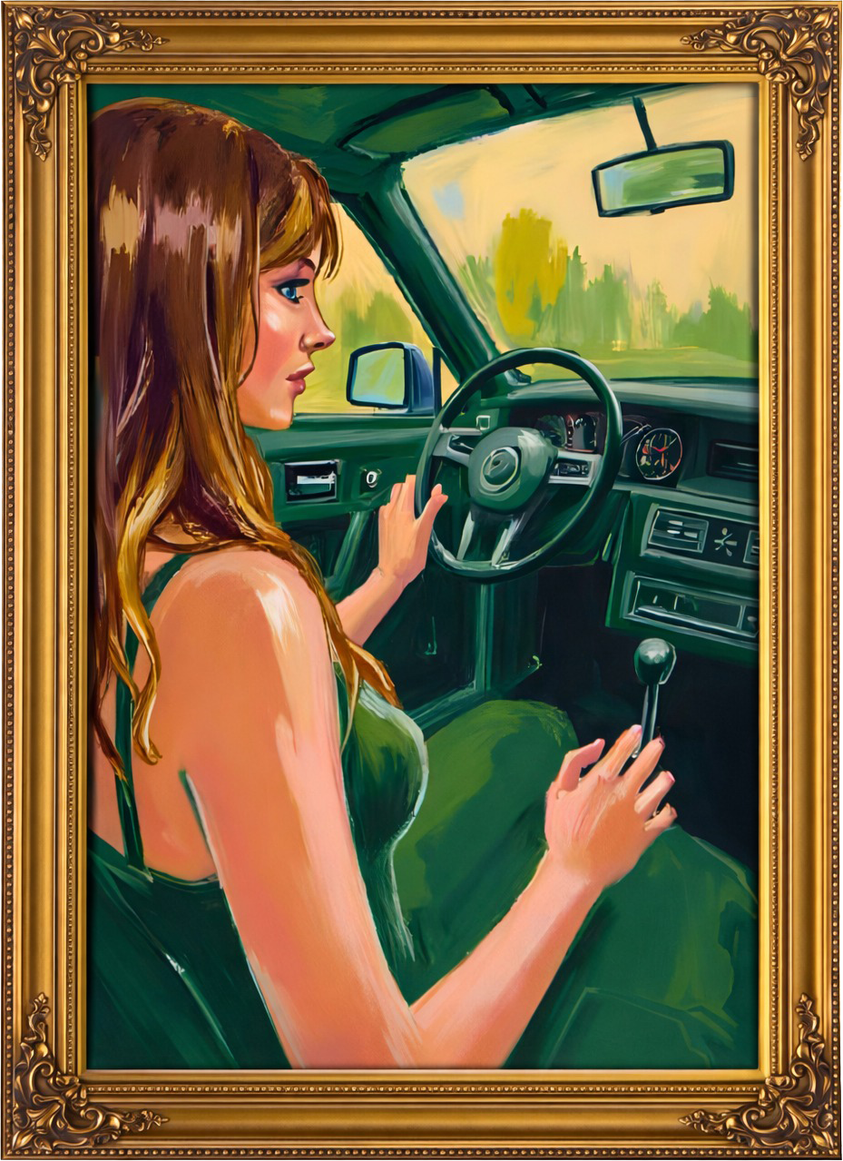Her hands on the wheel embody mastery, clarity, and the deliberate choice of her path.
